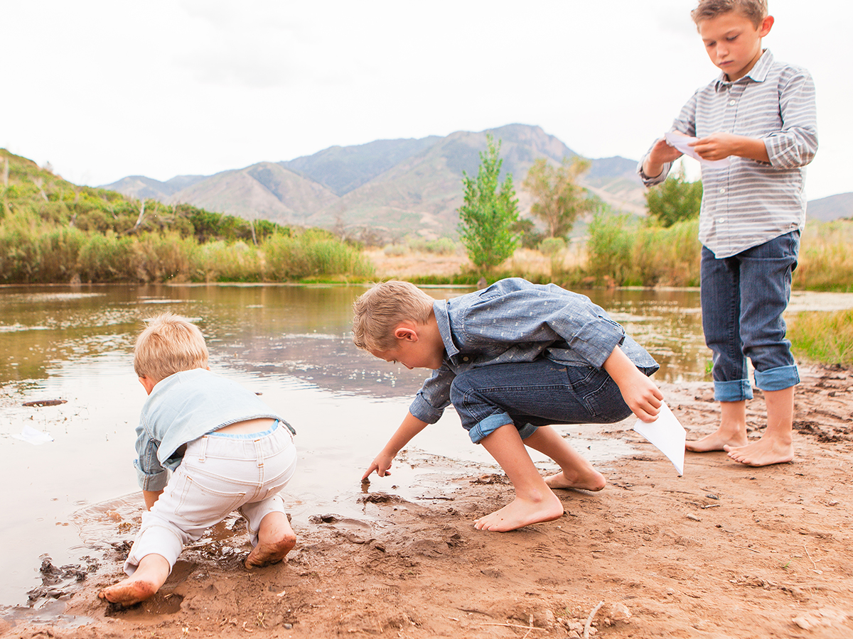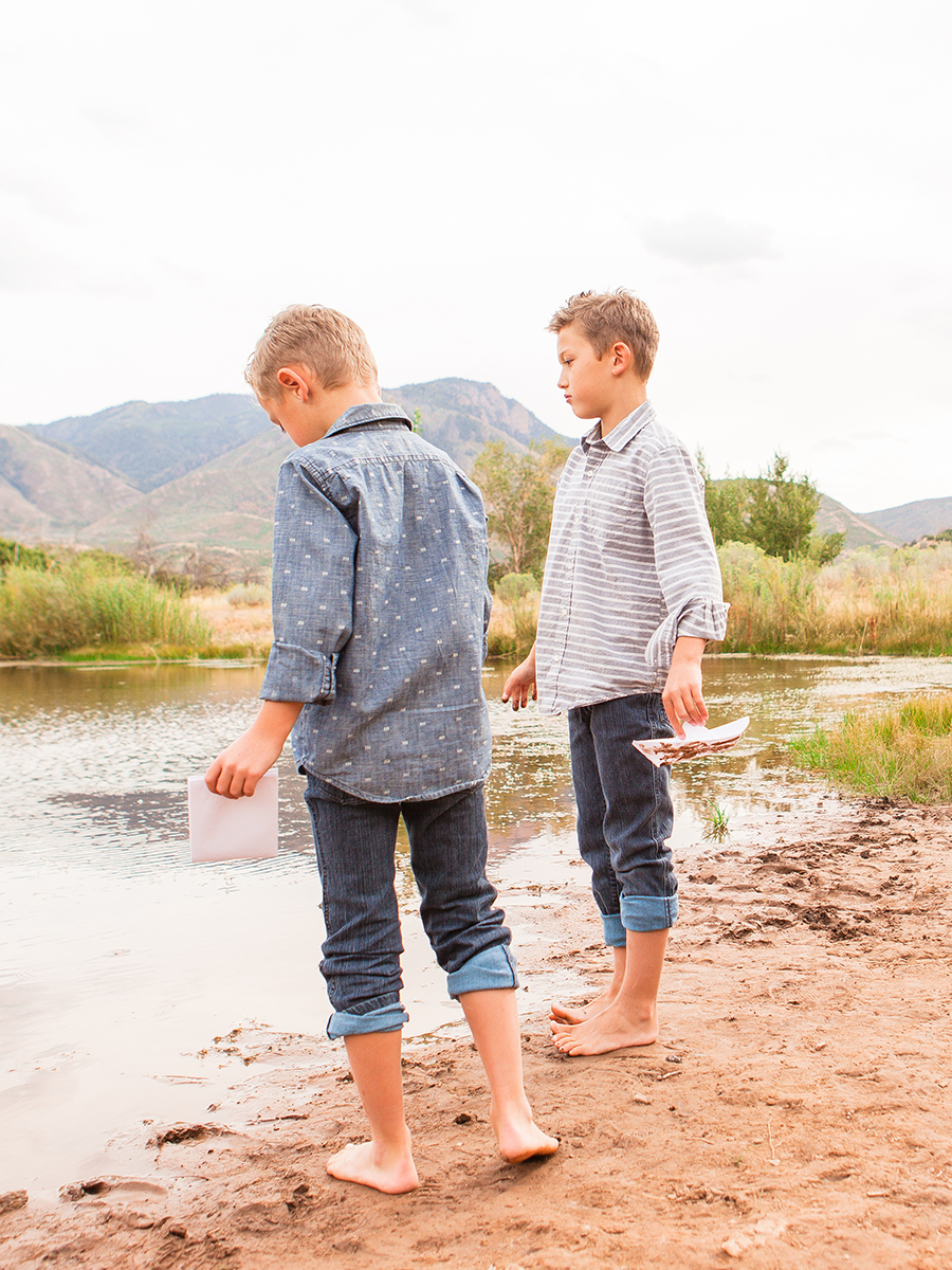 One day, during the summer a few years ago, I thought it would be a good idea to take my kids up the canyon to a small pond and take their pictures as they floated paper boats on the water. Of course I envisioned really cute pictures of them playing together with the perfect sunset behind them.